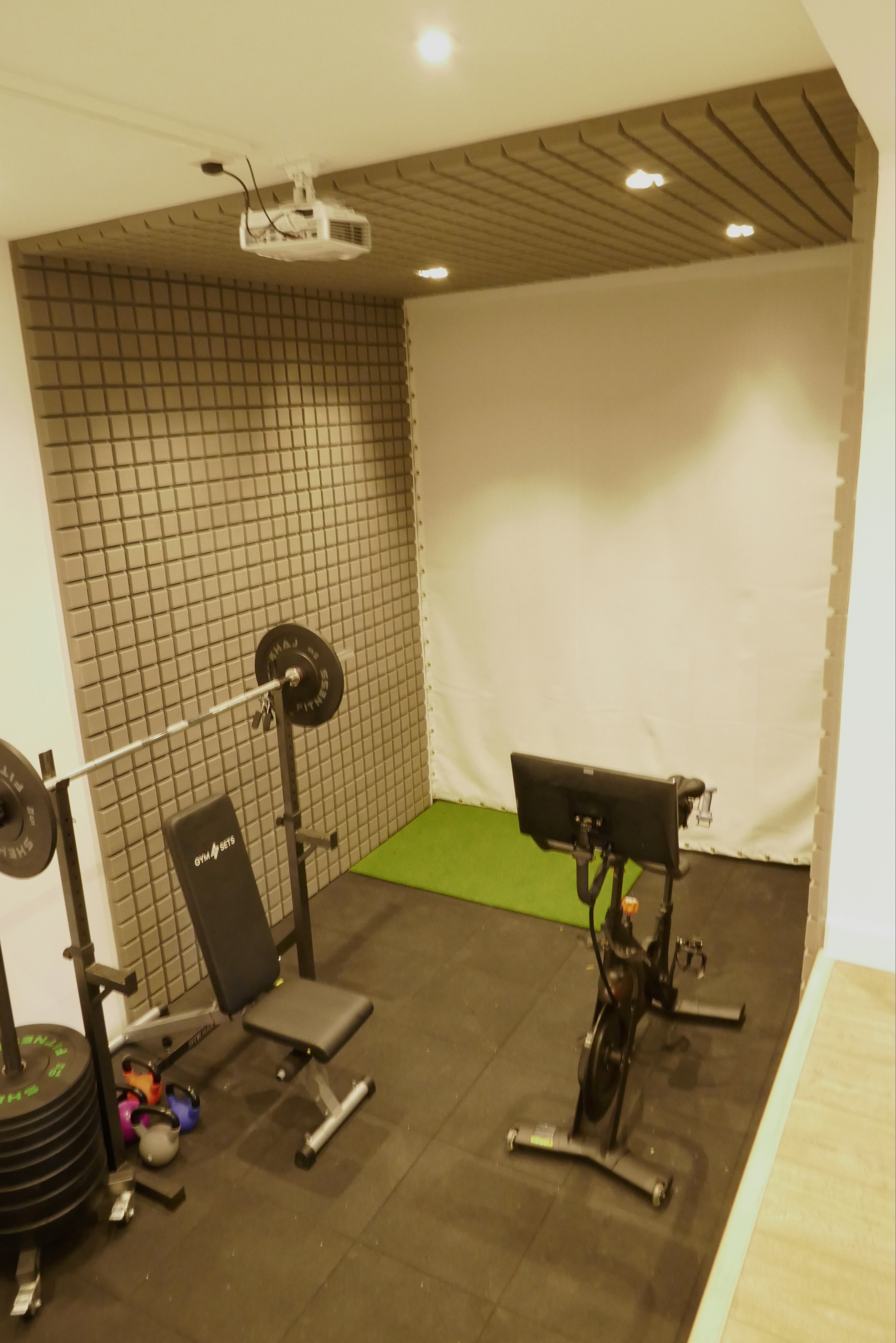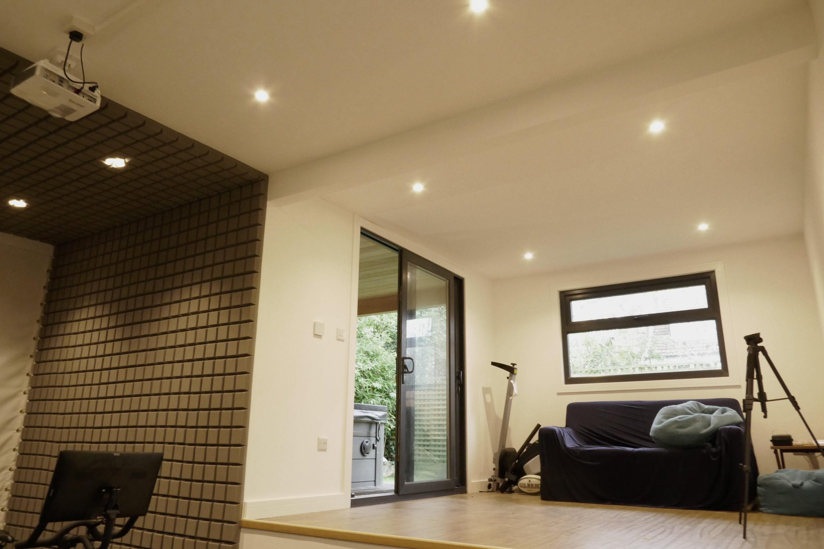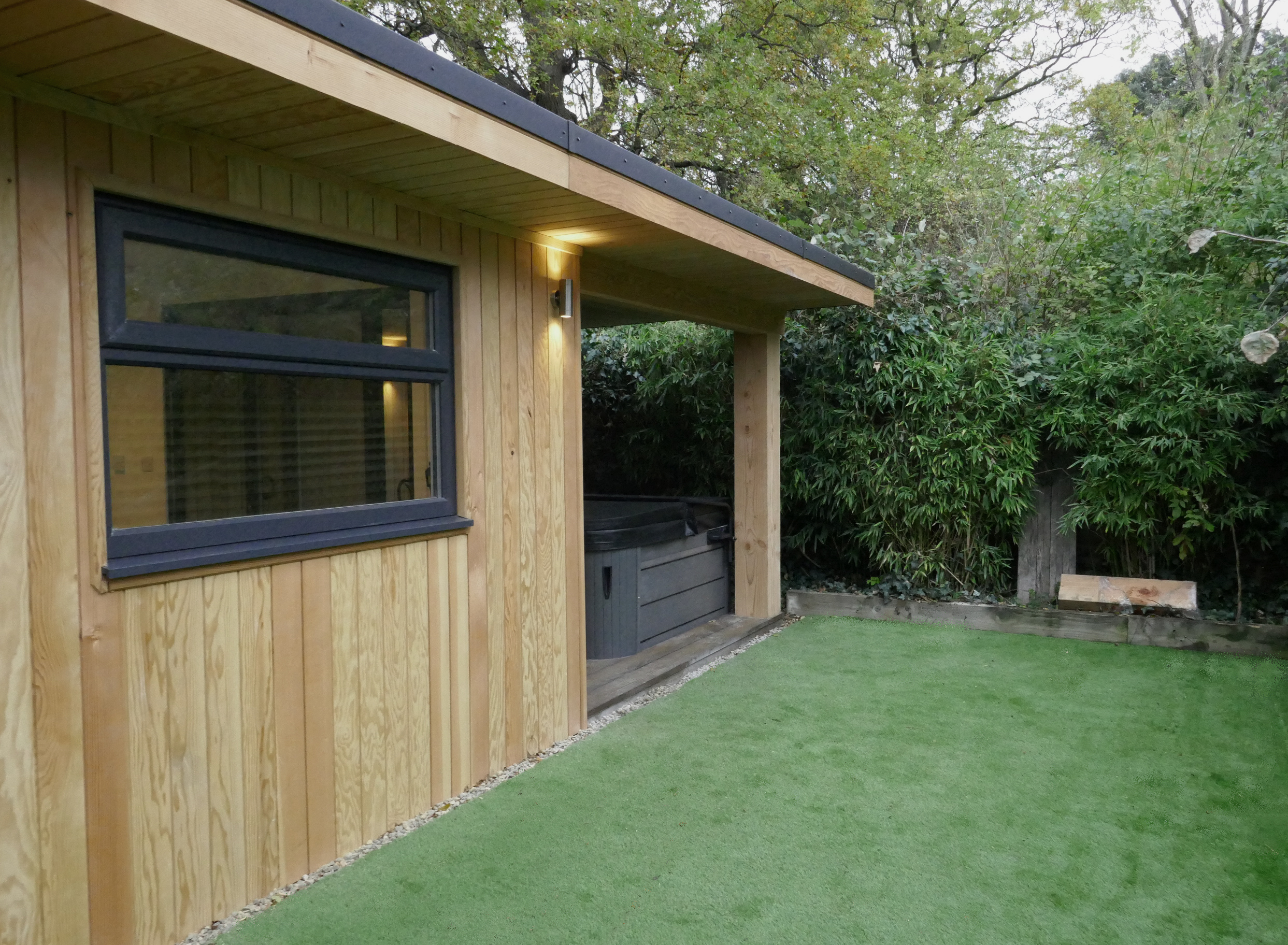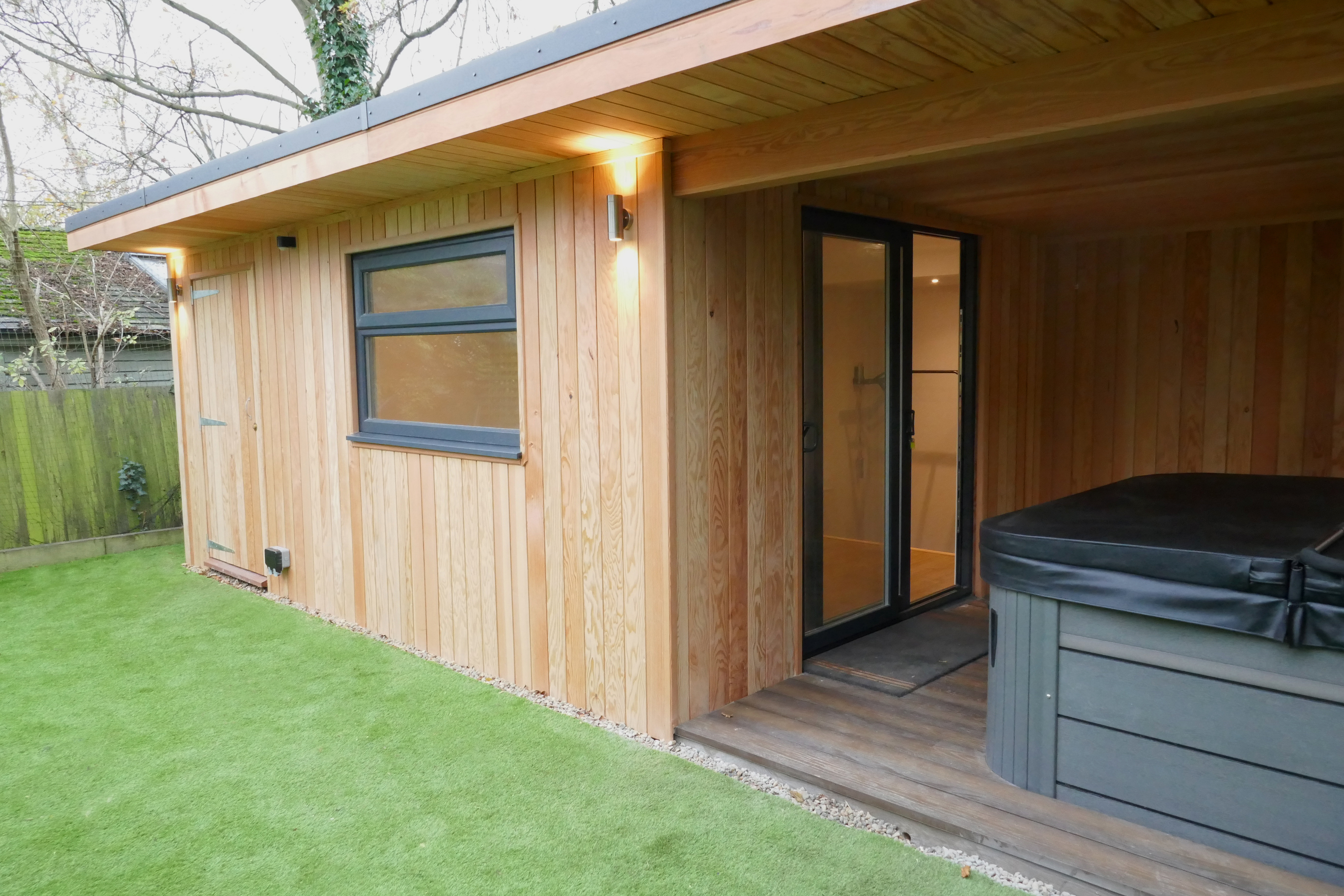 Young family with 3 football enthusiastic sons. We laid a football grade artificial pitch and at the far end a gym room with separate storage facility on right side. This unique structure includes sliding doors with a third fixed framed window to optimise light. This was our first outbuilding to be cladded with Douglas Fir.